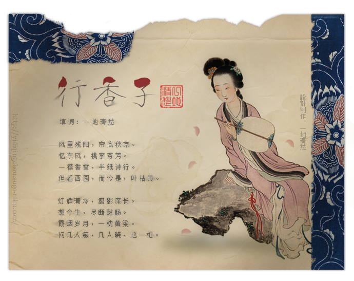 【行香子】填词:一地清愁 风里残阳,帘底秋凉。 忆东风,桃李芬芳。 一襟香雪,半纸诗行。 但看西园,而今是,叶枯黄。 灯辉清冷,瘦影深长。 想今生,尽断愁肠。 霞烟岁月,一枕黄粱。 问几人痴,几人晓,这一桩。 |