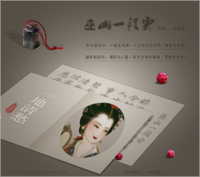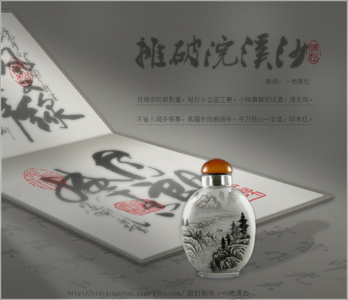 【摊破浣溪沙】填词:一地清愁 月地凉阶碎影重,轻衫小立欲三更。 小院廊前初試酒,倚東風。 不省人間多恨事,低眉長向曲词中。 千万愁心一字落,印朱紅。 |