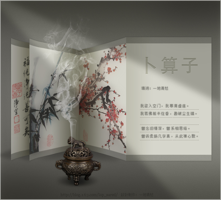 【卜算子】填词:一地清愁 我欲入空门,我慕清虚座。 我若佛前半炷香,勘破尘生错。 曾念旧情深,曾系相思络。 曾诉柔肠几字真,从此禅心默。 |